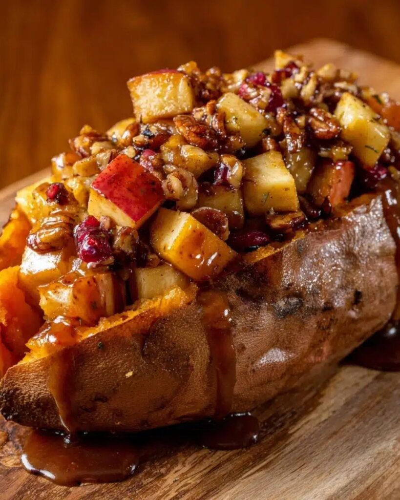 Looking for a cozy, comforting dish that celebrates everything you love about fall? Apple Spiced Stuffed Sweet Potatoes are a perfect choice. Roasted sweet potatoes are filled with tender maple-glazed apples and warm, fragrant spices. Topped with crunchy pecans or tangy cranberries and a dollop of Greek yogurt or whipped cream, this dish is vegetarian, gluten-free, and utterly delicious.