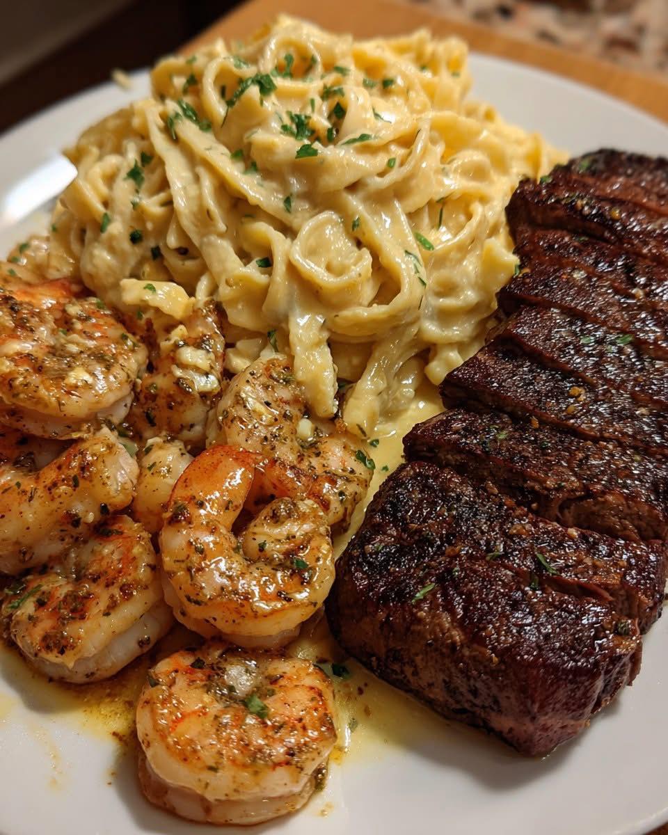 Indulge in the bold flavors of Cajun cuisine with this Blackened Steak and Shrimp Alfredo. Juicy, spice-crusted steak and succulent shrimp are nestled in a creamy, cheesy Parmesan sauce tossed with tender fettuccine. The smoky, slightly spicy notes of Cajun seasoning perfectly complement the richness of the Alfredo, creating a restaurant-worthy dish right in your kitchen. Perfect for date nights, special dinners, or any time you crave comfort with a kick, this pasta is as impressive as it is satisfying.