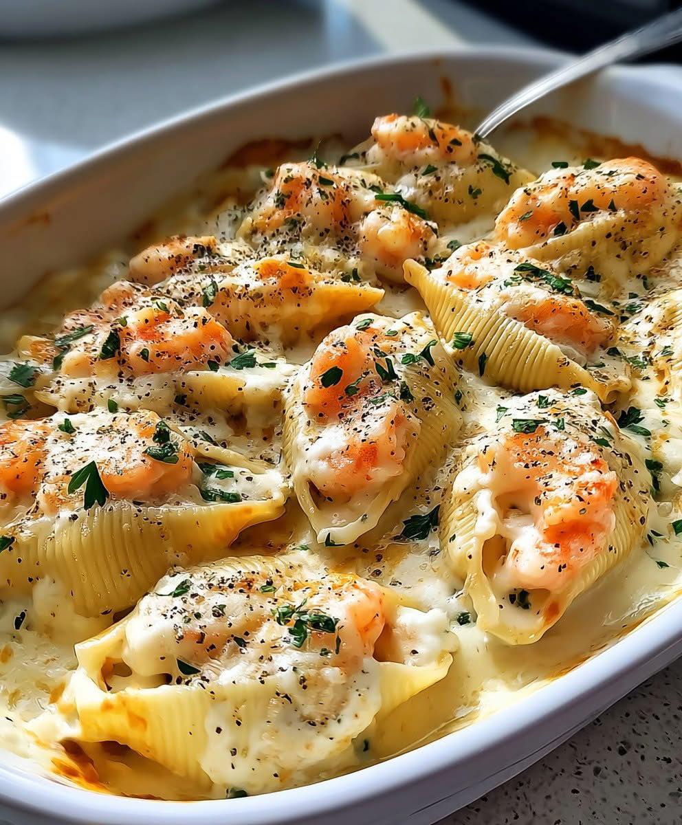 Cheesy Shrimp Alfredo Stuffed Shells — Creamy, Dreamy, and Totally Irresistible 💛