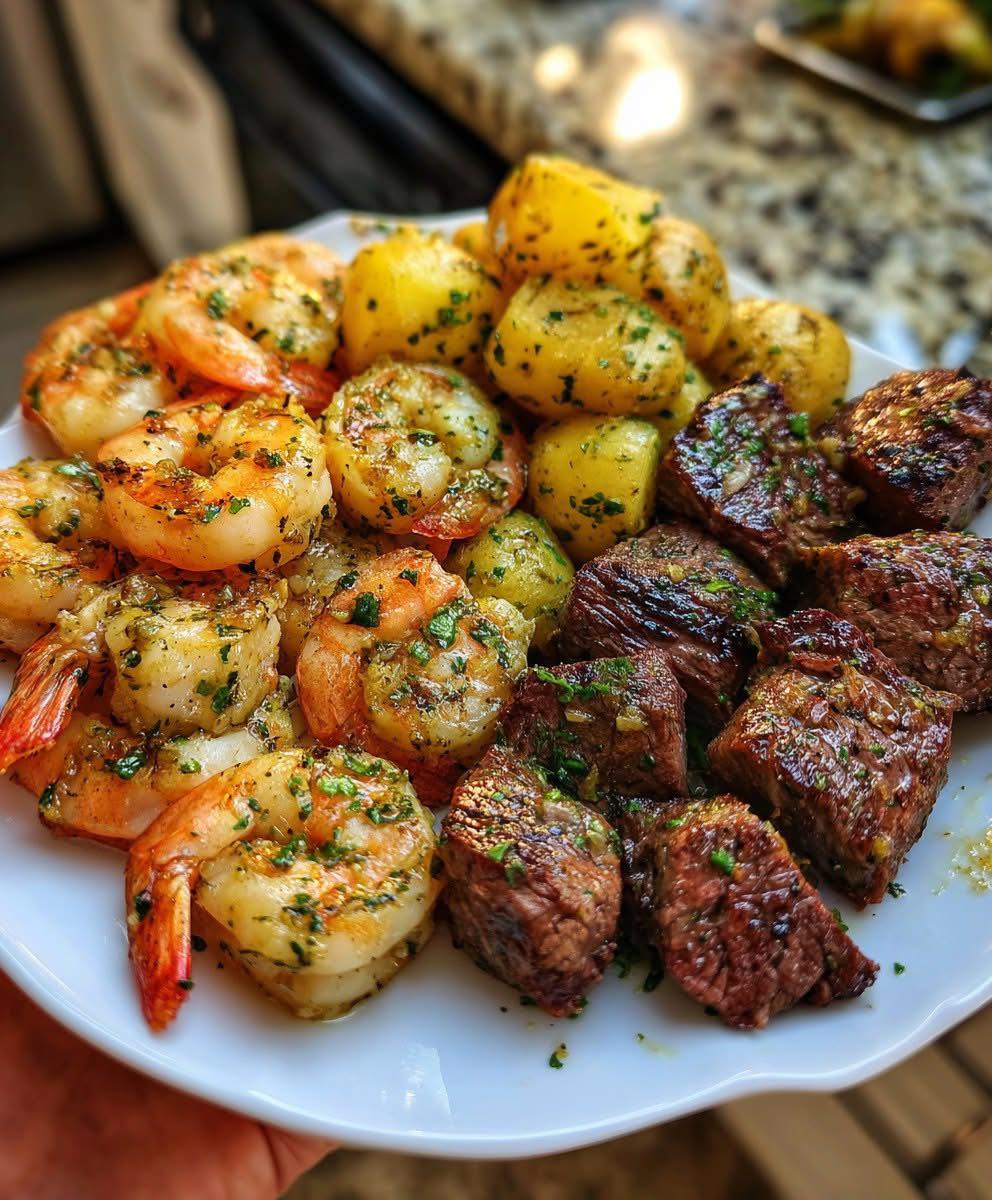 Garlic Butter Shrimp & Steak Bites with Veggie Potatoes 🧄🥩