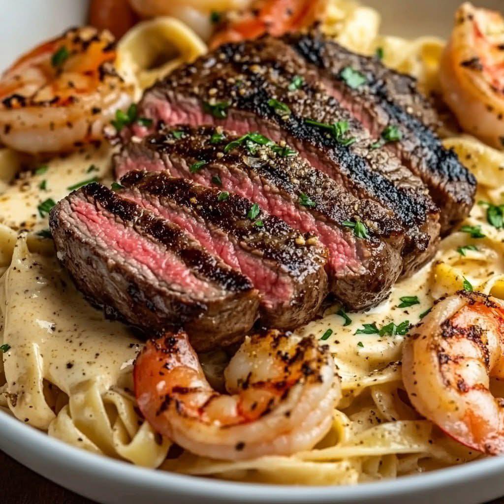 Elevate your pasta night with this indulgent Grilled Steak & Garlic Butter Shrimp Fettuccine Alfredo. Tender, juicy steak and succulent shrimp meet a luscious, creamy Alfredo sauce, tossed with perfectly cooked fettuccine for a rich and satisfying meal. Garlic butter amplifies the flavors, while a sprinkle of Parmesan and fresh parsley adds the perfect finishing touch. Quick enough for a weeknight yet impressive for guests, this dish is a true crowd-pleaser that combines surf, turf, and comfort in every bite.