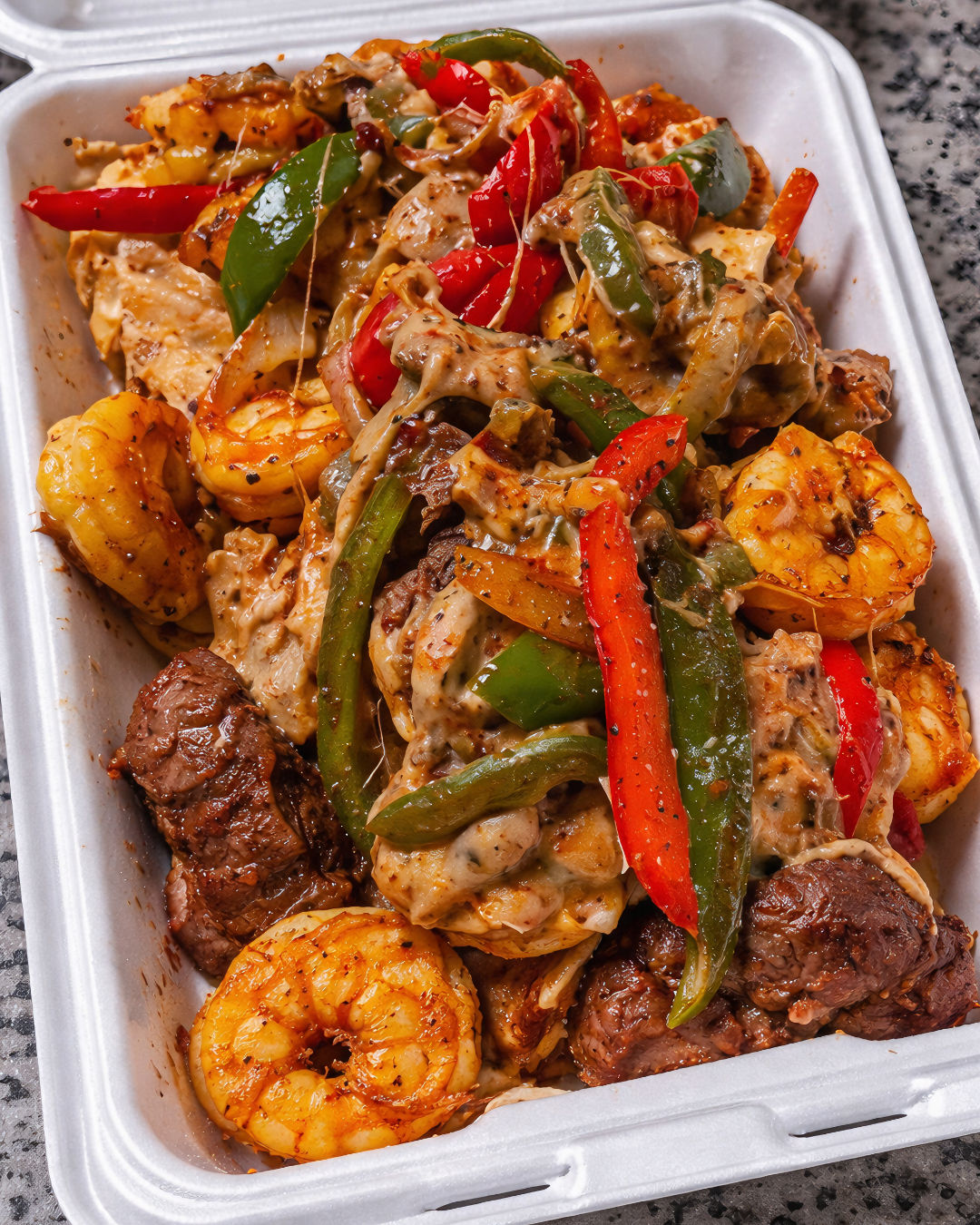 Juicy Steak and Shrimp Sizzling with Vibrant Peppers