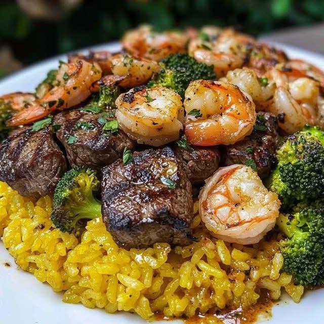 This Loaded Yellow Rice Plate is the ultimate comfort-meets-indulgence meal. Tender grilled steak, garlicky butter shrimp, and vibrant sautéed vegetables sit atop fragrant, golden yellow rice, creating a feast that’s as visually stunning as it is flavorful. Each bite combines smoky, savory, buttery, and fresh notes, delivering a well-balanced plate that satisfies both the eyes and the appetite. Perfect for a hearty weeknight dinner, meal prep, or weekend indulgence, this dish brings restaurant-quality flavors right into your home kitchen.