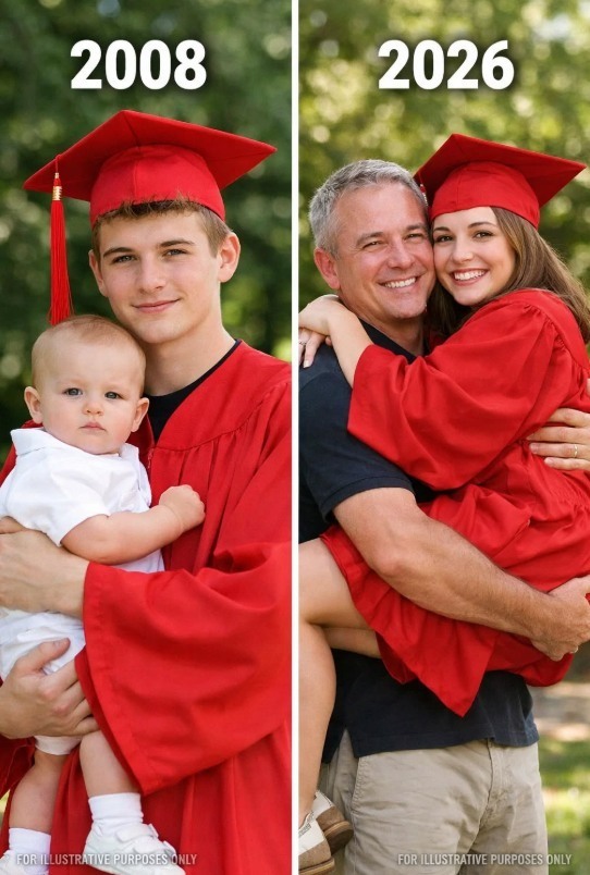 In the photo, a skinny teenage boy stands on a football field wearing a crooked graduation cap. He looks terrified. In his arms, he’s holding a baby wrapped in a blanket. Me.