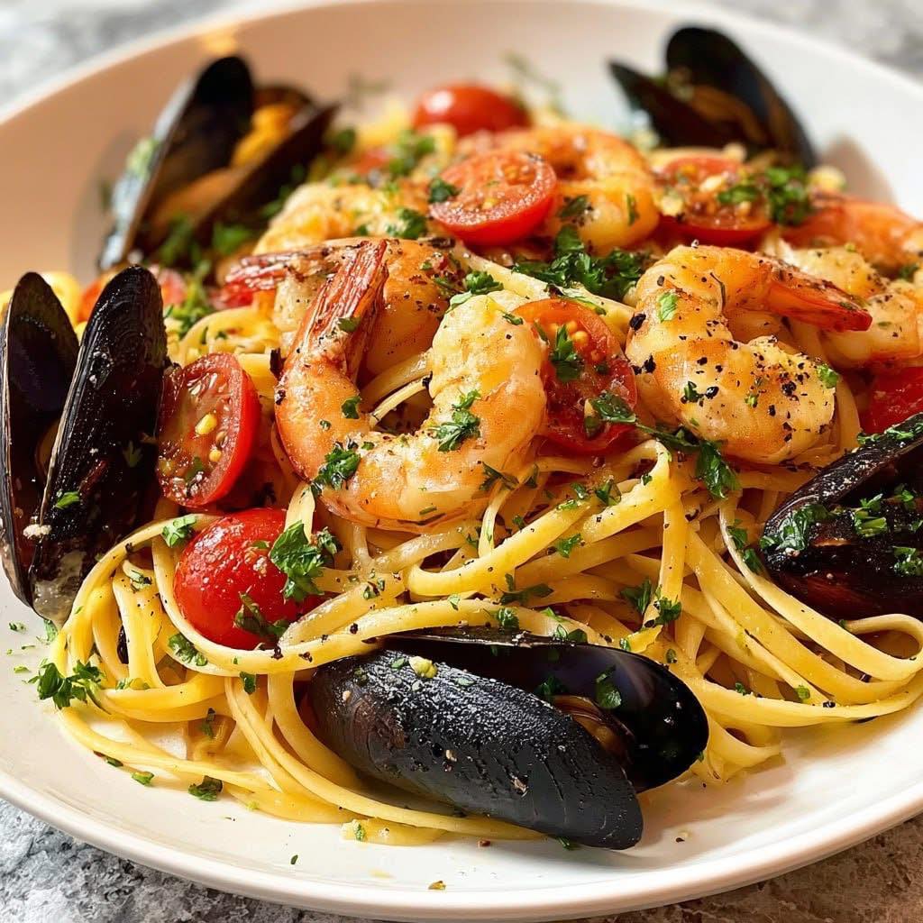 Delicate seafood meets al dente pasta in this luscious Seafood Linguine with Garlic White Wine Sauce. Juicy shrimp, tender mussels, and sweet cherry tomatoes are coated in a silky, garlicky sauce made with butter, white wine, and a touch of lemon. Quick to make yet elegant enough for a special dinner, this dish brings the taste of the Mediterranean right to your table. Perfect for a weeknight treat or entertaining friends, it’s a true celebration of fresh flavors and simple, luxurious ingredients.