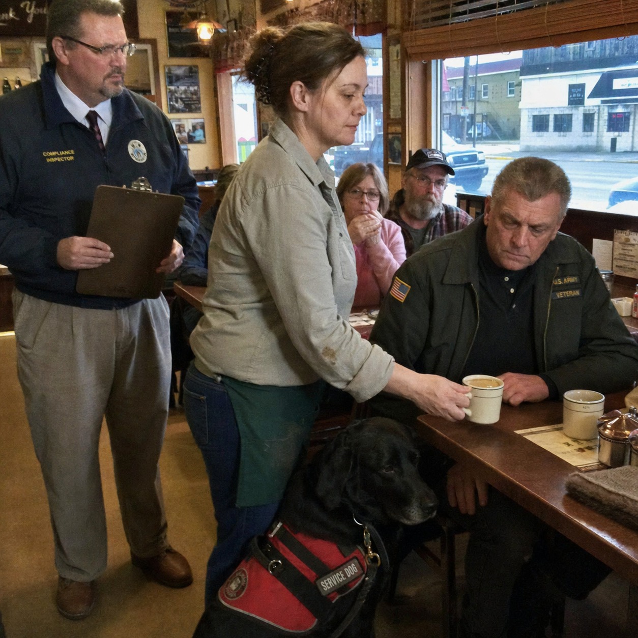She set a mug of coffee in front of a veteran and his service dog while the compliance inspector was still watching, and ten minutes later her boss erased six years of loyalty with one cold sentence.