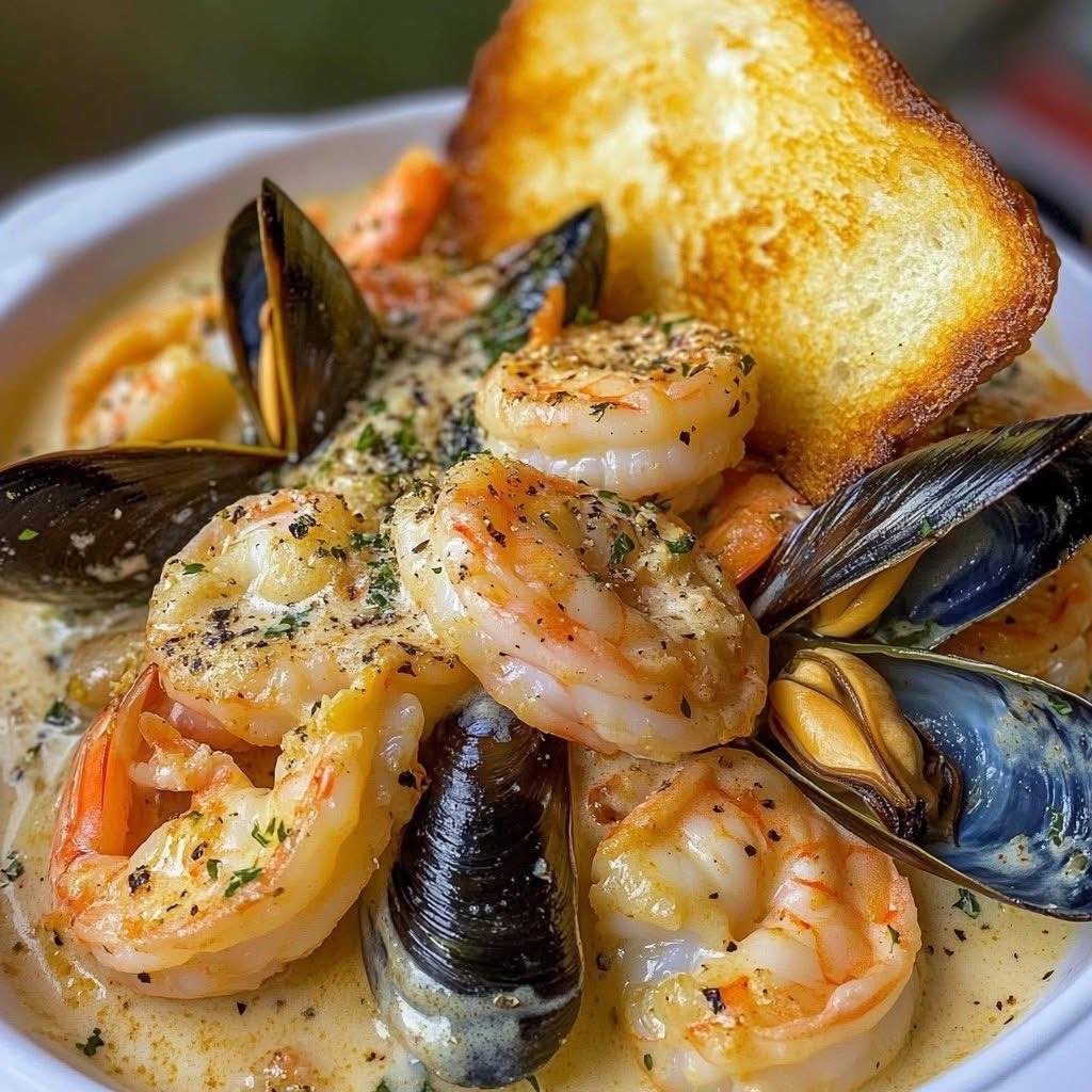 Few things feel as comforting and indulgent as a creamy seafood dish served with warm, crispy garlic bread on the side. This Shrimp & Mussels in Creamy Garlic Sauce brings together the delicate sweetness of tender shrimp and the briny richness of fresh mussels, all simmered in a velvety, garlicky cream sauce that’s impossible to resist. It’s the kind of meal that turns an ordinary dinner into something special — whether you're hosting guests or simply craving a cozy homemade seafood feast. Paired with golden garlic bread to soak up every drop of sauce, this dish delivers pure comfort in every bite.