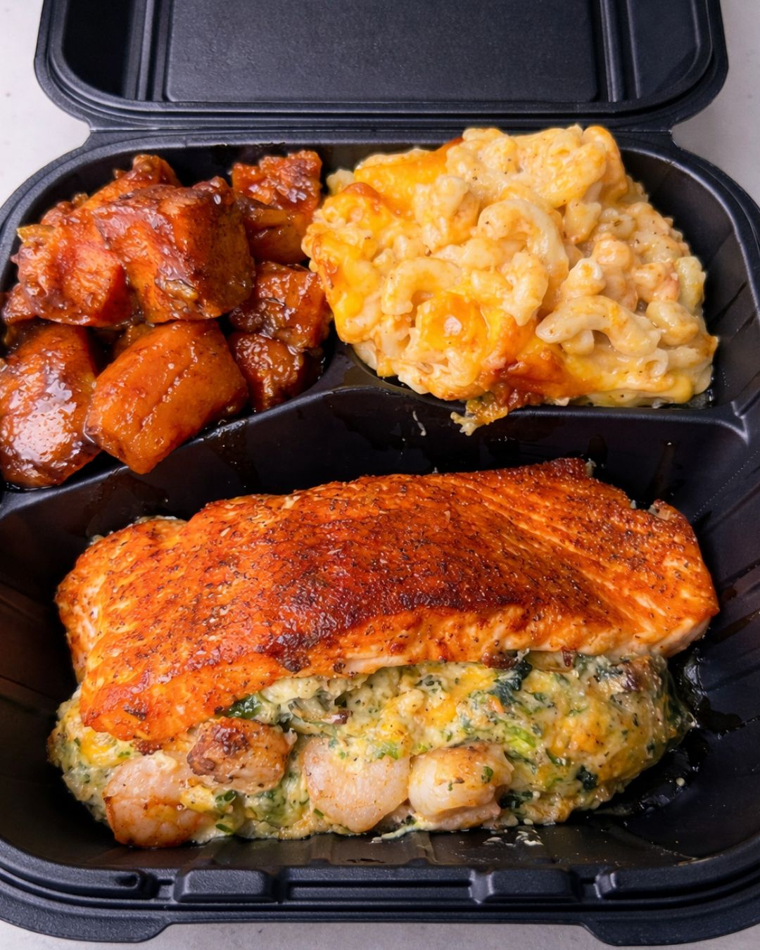 Stuffed Salmon with Mac and Sweet Glazed Bites 🍣🧀🍯