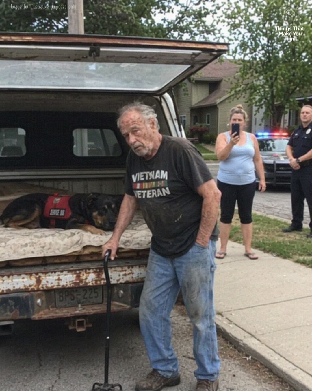 Just a seventy-year-old man with a cane, a “dangerous” dog in the back, police lights flashing, and neighbors screaming.